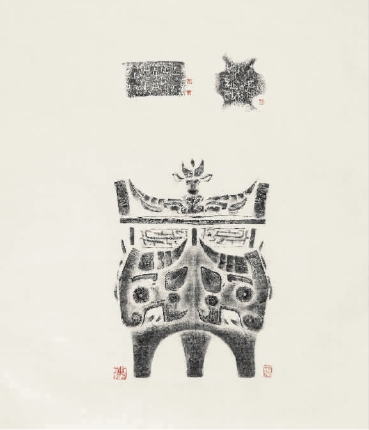 “傳拓”俗稱拓片,若要對青銅器器形進行傳拓,就必須采用全形拓的方法。全形拓是一種以墨拓作為主要手段,將古器物的立體形狀復制表現在紙面上的特殊傳拓技法,又名“立體拓”“器形拓”“圖形拓” ?!昂诳萍肌钡漠a生必然有個傳說:相傳清嘉慶年間,蘇州焦山寺有一尊青銅鼎,寺僧六舟和尚秉燭賞鼎,發現墻上映出鼎的影像。他靈機一動,把原器的尺寸量好畫出輪廓,再以厚紙做漏子,用極薄六吉棉連紙撲墨拓,這樣青銅器愛好者們不用登門也能見識鼎的形象。這種拓前需先用白芨水刷在器物上,再用濕棉花上紙,待紙干后,以綢包棉花拓印額形式,就是全形拓。它要求拓技者具備熟練的素描、繪畫、裱拓、傳拓等技法,把器物原貌轉移到平面拓紙上的一種特殊技藝。一時間,全形拓工藝成為潮流,無數文人墨客、金石學家都沉浸在全形拓的樂趣中,金石學家阮元還邀六舟和尚將家藏青銅器全部制成全形拓,而全形拓也為他們欣賞研究青銅器提供了非常難得的材料。