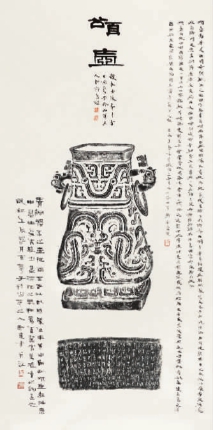 周希丁的弟子傅大卣繼承了他全形拓的技藝,而賈文忠正是師從于傅大卣的傳承人。自幼受家庭熏陶酷愛金石書畫的賈文忠十幾歲即隨父習業,深得銅器修復要領,又拜康殷、傅大卣等為師,學習金石篆刻、書畫、鑒定。他先后在北京市文物局、首都博物館、中國農業博物館從事文物保護、修復、鑒定、研究等工作近40年,修復過數千件青銅器,鑒定青銅器不計其數,其中不乏國寶重器,這使他有機會創作全形拓,并在全形拓基礎上潛心研究穎拓技藝。據他介紹,當代青銅器全形拓的拓法是在拓器物前,選擇最能代表該器物特征的最佳角度,用鉛筆在準備好的棉連紙上畫出一個“⊥”形圖,以表示器物的垂直線和水平線,再在“⊥”形圖上標出器物的高度、寬度為基礎,畫出被傳拓器物原大的線描圖,隨后把標有器物各部位位置的棉連紙分先后覆在被拓器物上,用蘸有白芨水的毛筆刷濕,上紙,用棕刷刷實,用墨拓黑后揭下,這樣多次拓完器物的各個部位,完成全形拓。他采用了古人傳統全形拓方法,所拓器物全形準確與實物不二,透視合理,紋飾清晰、絲絲入扣、銘文規范、筆畫有序、效果逼真、賞心悅目,作品更邀請多位藝術家為之補繪或題跋,既充分展現了傳統技藝之美,又有當代文化的介入,文質兼備。