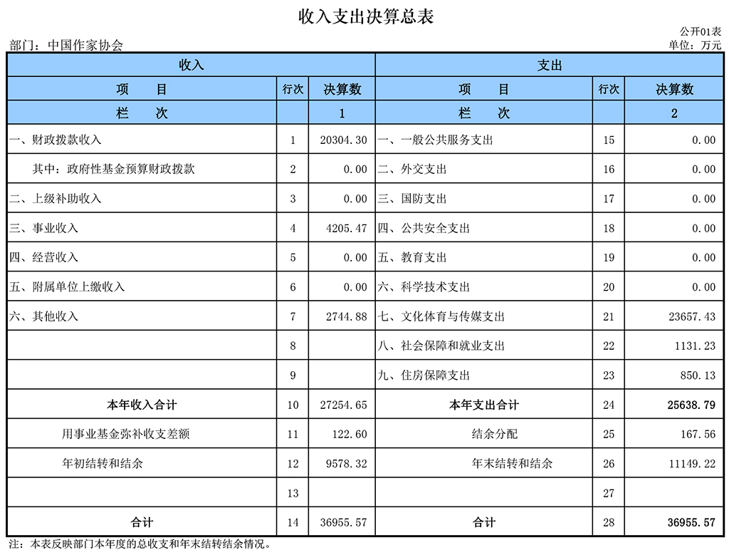中國作協2016年度收入總計36955.57萬元,支出總計36955.57萬元。與2015年相比,收、支總計各增加255.38萬元,同比增長0.70%。