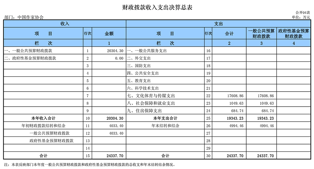 中國作協2016 年度財政撥款收支總決算24337.70萬元。與 2015 年相比,財政撥款收、支總計各減少407.71萬元,下降1.65%。
