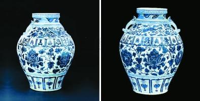元,青花纏枝牡丹紋摩羯魚耳大罐。