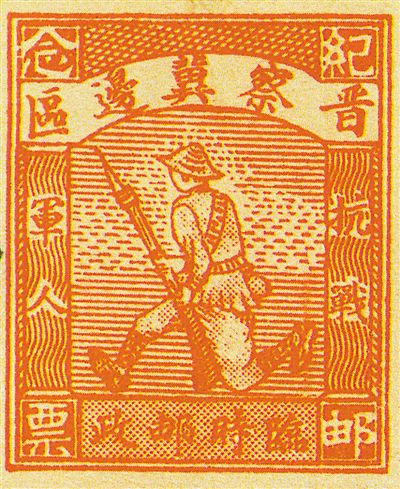 抗日戰爭中,人民軍隊是抗戰的“中流砥柱”。1938年,晉察冀邊區臨時郵政總局發行了“軍人免資貼用”郵票,即珍郵“抗日軍人圖”(圖③)。這枚郵票,留下了那個艱苦年代的印記。畫面以質樸簡約的線條,勾勒出抗日軍人持槍向前線的形象。頗具時代感的勁礪的木刻風格,富有動感和感召力,雖不華但有氣度,雖簡單但蘊內涵。紅色的單色印制,又若烽火燃起的戰場,具有引發聯想和置身實地的雙重藝術效果。
