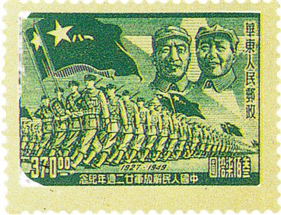 1945年10月,山東解放區的山東戰時郵務總局發行了第一枚“中共八一建軍紀念”郵票(圖⑨)。這一枚郵票,主圖是朱德總司令威嚴的戎裝肖像,背景是軍旗引導下的軍隊行進。主圖之外的邊飾,印有“中共八一建軍紀念”“1927—1945”和“山東戰郵”的字樣。