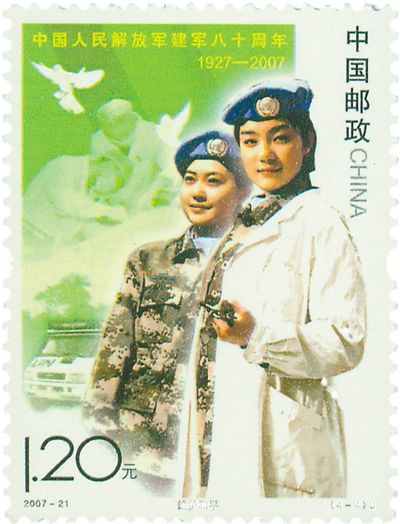 2007年發行的建軍紀念郵票,全方位表現了人民軍隊的神圣職責。郵票上,第一次出現了軍旗輝映下的抗洪搶險場面,以及參與聯合國維和行動的中國軍人的英姿(圖⑧)。這套郵票以“聽黨指揮”“服務人民”“英勇善戰”和“維護和平”四幅郵圖,表現了可以信賴、可以依靠的人民軍隊。新世紀的絢麗色調,讓這套具有革命傳統的主題郵票,有了煥然一新的神采面貌。