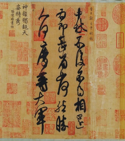 《快雪時晴帖》 是晉朝書法家王羲之的書法作品,以行書寫成,紙本墨跡?!犊煅r晴帖》 是一封書札,其內容是作者寫他在大雪初晴時的愉快心情及對親朋的問候,收藏于臺北故宮博物院。王獻之 《中秋帖》 又名《十二月帖》,以草書寫成,現存北京故宮博物院。王珣 《伯遠帖》 以行書寫成,現藏于北京故宮博物院?!吨星锾?和 《伯遠帖》 在清末溥儀出宮時被帶出紫禁城,后來輾轉流傳在外,1950年購回交與北京故宮博物院收藏。
