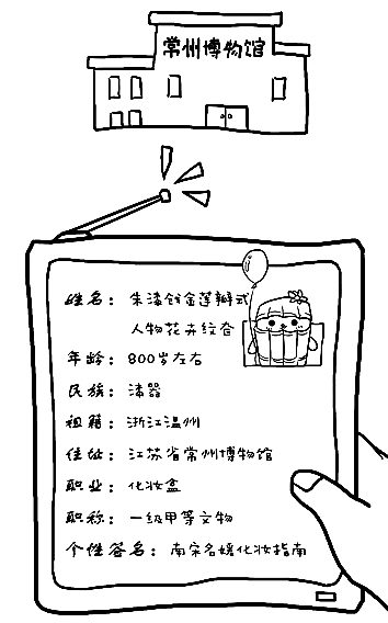 小女子來自江蘇省的常州博物館,是用漆樹的汁液涂在器物的表面制成的器物,身份證上名叫“南宋朱漆戧(音“嗆”)金蓮瓣式人物花卉紋奩”。這么復雜的名字是文物專家們為了準確描述我的特征而取的全名。起這種又長又難讀的名字,上課老師提問一定不會點到我吧?