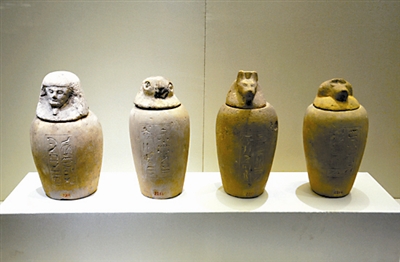 尼羅河孕育的古埃及文明史構成“文明之?!钡闹匾?。提到埃及,除了金字塔,人們大概會想到木乃伊吧。古埃及人視死亡為新生的起點,渴望生命不朽。他們在制作木乃伊時,會將尸體的內臟取出,處理后放入容器內保存。這種用于保存死者內臟的容器稱為卡諾皮克罐,與石棺及其他葬禮用品一起擺放在墓室里,一般是以石灰石或陶制成的平底罐形,頸部稍寬,以塞子封口。從新王國時代起,封口的塞子就做成了代表荷魯斯四個兒子相應的人和動物形象。分別是:人形守護神伊姆塞特,保護肝;狒狒模樣的神哈匹,保護肺;鷹頭模樣的神凱伯塞努夫,保護腸;豺狼頭模樣的神杜瓦姆太夫,保護胃。在將尸體制成木乃伊的過程中,肝、肺、腸、胃都會被移除,分別保存在這四個罐中。在古埃及人眼里,來世與人間一樣,對秩序的要求都是至高無上的。