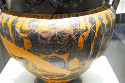 這件古希臘陶杯,描繪的是為爭奪一具尸體進行的決斗。誰的尸體?他是怎么死的?哪些人在決斗?為什么決斗?死者名叫帕特羅克洛斯,是希臘名將阿喀琉斯的好朋友。阿喀琉斯與希臘聯軍統帥阿伽門農因為女戰俘分配不均而爭執,憤怒地退出戰斗。沒有阿喀琉斯,希臘聯軍節節敗退,為了希臘,帕特羅克洛斯穿上阿喀琉斯的鎧甲上陣,結果被特洛伊王子赫克托耳殺死。阿喀琉斯為報殺友之仇,重返戰場。赫克托耳與阿喀琉斯交鋒,不敵而逃,阿喀琉斯圍著特洛伊城追了三圈,殺死赫克托耳,并用戰車拖辱尸體,慘不忍睹。特洛伊國王普里阿姆只身前往敵營,跪在阿喀琉斯的腳下,用重金、哀求、真情打動阿喀琉斯,討回兒子的尸體。雙方休戰,各自舉行葬禮。死亡平息了阿喀琉斯的憤怒。