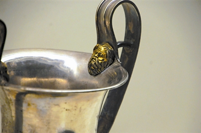 會飲是古希臘一項歷史悠久的文化古風,在荷馬時代就可見到些許端倪,大家通常在競技或者節日之后聚在一起,一邊觀賞娛樂,一邊吃飯喝酒,聊些輕松愉快的話題。飲酒的器具則彰顯了主人的地位,康塔羅斯酒杯是一種帶有兩個高柄的大酒杯,為飲酒的最佳器皿,因此被認為是狄奧尼索斯的標志之一。這只康塔羅斯酒杯來自羅希尼奧,是現存于世的極少數幾只珍貴金屬器皿之一,也是大希臘地區出土餐具中的大型酒器的經典之作。