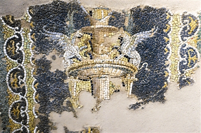 眼前漂亮的馬賽克鑲嵌畫,來自哪里呢?皮皮亞諾山上的寧芙廟。寧芙廟是希臘羅馬時期一類特殊的建筑,起源于有泉水或溪流的洞窟。后來演變為一種有噴泉、雕塑、花草壁龕的花園,既被用作祭祀寧芙女神之地,也被視為休閑之地或舉辦婚禮的場所。1980年至2001年期間,那不勒斯考古管理局在對馬薩盧布倫塞地區的考古挖掘中發現了這座羅馬寧芙廟,該廟或許是卡帕尼亞地區迄今發現的保存最為完好的寧芙廟。它坐落在皮皮亞諾山上一個雄偉壯麗的位置,與卡普里島遙遙相望。廟墻由灰色的卡帕尼亞凝灰巖塊堆砌而成。后側的墻被分割為十二個壁龕,中央瀑布的兩側各分布有五個,瀑布中則有兩個半圓形小壁龕,整個墻體飾有各種玻璃、埃及藍石灰石和彩色石灰石的馬賽克圖案,不同區域使用貝殼隔開。壁龕的裝飾呈對稱格局,以中央瀑布為中間線,左右對應,主題是一座百鳥爭鳴、百花怒放的花園,描繪了飛禽、走獸、海怪、樹木花卉等形象。