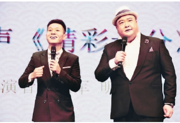 范軍(右)和他的徒弟明男男在表演相聲《精彩十分》 趙志偉 攝
