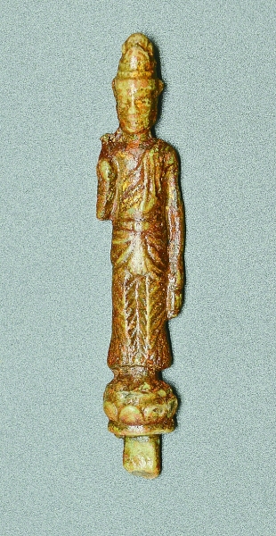 何金龍說,這次出土的文物主要出土于三號發掘區內,有漢晉時期紋飾殘墓磚2塊、南詔有字殘瓦338片、南詔殘花紋磚7塊、殘方磚21塊、殘綠釉磚2塊、殘陶鴟吻10件、殘紅砂石佛首1件、完整青銅鎏金楊枝觀音立像1件、青銅金剛杵1件、殘綠釉陶瓶2件、殘綠釉陶碗1件、殘黃釉陶盞1件、殘灰陶盞1件、貼金箔夾砂陶片4小塊、開元通寶2件、殘滴水16件、殘瓦當24件等。
