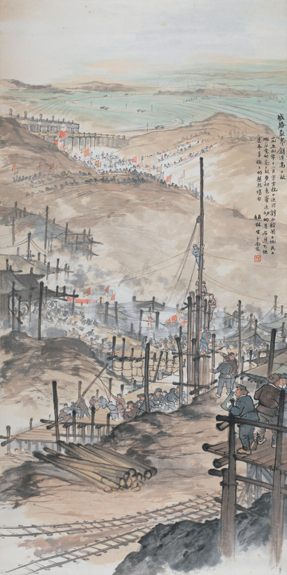上世紀50年代至70年代,伍霖生的藝術創作和時代背景緊密相聯,在火熱的社會主義改造與建設之中,他將創作的視角轉向謳歌與表現時代生活中去。同當時的眾多山水畫家一樣,伍霖生開始嘗試將工農形象和山水畫的場景結合起來,上世紀五六十年代他創作了《山區豐收運糧忙》《放鴨子》《紅在農中專在農中》等作品深刻地烙上了時代的印記,通過對工農形象的刻畫,表現了新時期涌現出來的社會新氣象、新面貌。山水畫在表現社會主義建設成果與革命勝跡方面有著技法上的優勢,1953年伍霖生根據安徽佛子嶺水庫寫生創作的《佛子嶺水庫》表現了新中國大型水利工程的建設場面,1959年表現京杭大運河劉山船閘工地建設的《戰勝嚴寒》表現了熱火朝天的建設場景。南京長江大橋建設的成就是南京畫家經常表現的主題,在上世紀70年代伍霖生幾易其稿,創作作品《天塹變通途》,記錄了這一社會主義建設的偉大成就。在表現革命勝跡主題上,伍霖生以山水畫的形式,創作了《井岡山》《今日瀘定》《遵義誦》等作品,表達了畫家對于圣地的崇敬之心,在毛澤東同志詩意畫題材創作上伍霖生顯然受到傅抱石的影響,他創作了《登廬山》《六盤山》等作品,將革命的詩意和山水畫的藝術語言融合起來,豐富了這一類型山水畫的創作內容。