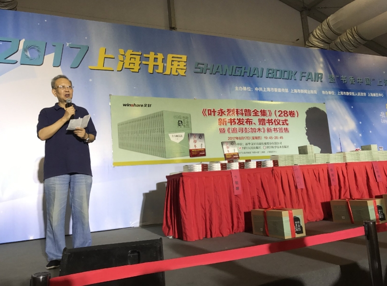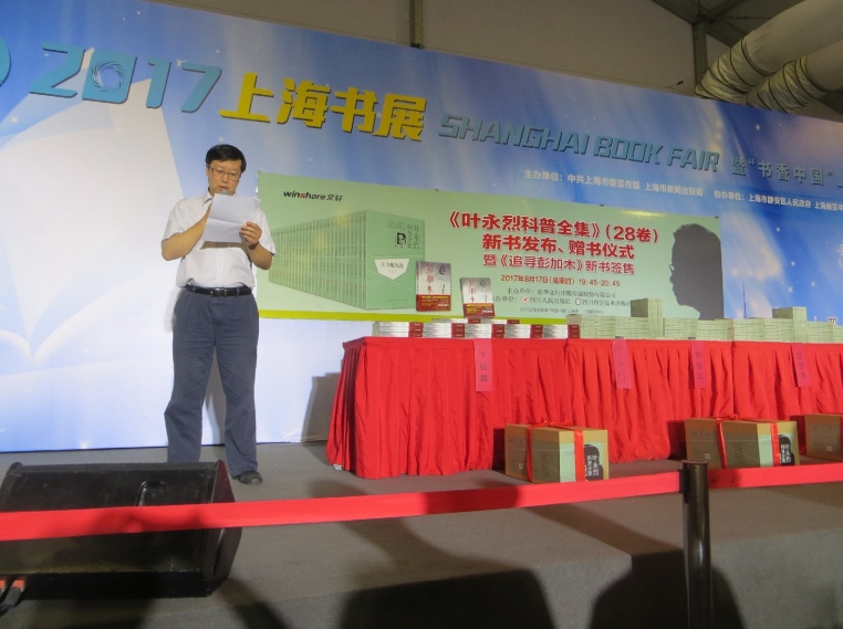 2017年上海書展《葉永烈科普全集》(28卷)新書發布、贈書儀式暨《追尋彭加木》新書簽售活動今天在這里隆重舉行,我謹代表上海市科普作家協會對這個活動的成功舉辦表達祝賀,并向葉永烈先生表達由衷的敬意。