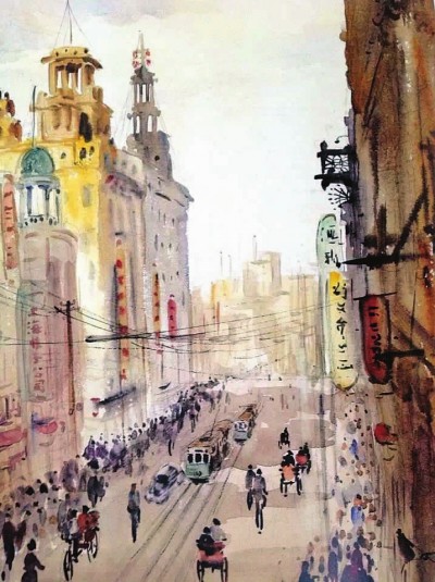 哈定經典水彩畫《繁忙的南京路》。(展方供圖)