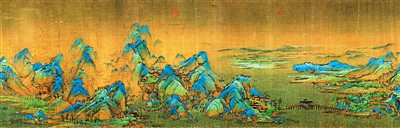 青綠山水畫最早出現在魏晉時期,到唐代形成了以大小李將軍李思訓、李昭道父子為代表的第一個高峰?!肚Ю锝綀D》是中國古代大青綠山水畫的經典代表作,體量宏大、構思周密、技法深入、色彩絢爛,它把古老的青綠山水畫推向成熟的高峰。