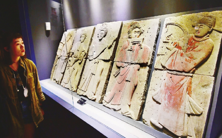 “留住色彩——陶質彩繪文物保護成果展”日前在西安秦始皇帝陵博物院開展。展覽展出了從先秦至元代的陶質彩繪文物121件(組)及非文物類展品,對陶質彩繪文物保護修復的相關原則、程序、基本技術知識等進行展示。圖為觀眾在展覽上參觀五代“彩繪浮雕磚” 。