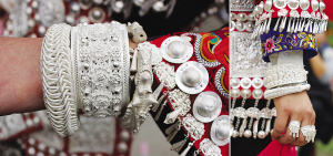 手鐲兩端的局部紋樣也頗具匠心:在使用了與主體部分相呼應的乳丁元素的基礎上,還運用纖細的銀絲勾勒出局部的特殊花朵造型,使局部在不影響整體和諧融洽的前提下,又不失個性。變化與統一并存的裝飾效果,打破統一所造成的沉悶感,增添了手鐲造型的豐富性和視覺的層次感。當手鐲表面的線性成分引導著人們的視線向兩邊延伸時,手鐲兩端的局部紋樣猶如形成了一種界限,產生了視覺上“盡頭”。這個“盡頭”將反復排列的乳丁元素和人們的視覺范圍,控制在了一個適當的“度”內,避免了裝飾元素過度重復所引發的乏味感和肆意蔓延導致的無序感。