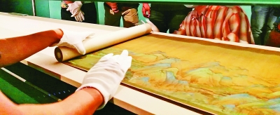 《千里江山圖》正被小心翼翼地展開。本報記者 李韻攝/光明圖片