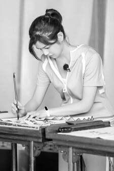 ▲嘉賓在濂溪書院誦讀《愛蓮說》。?嘉賓陳妍希在體驗女書寫作。 湖南衛視 供圖