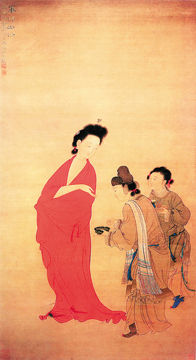 “貴妃出浴”在詩詞中也數不勝數?!按汉n浴華清池,溫泉水滑洗凝脂。侍兒扶起嬌無力,始是新承恩澤時?!保ò拙右住堕L恨歌》)“簾影罷添新翡翠,露華猶濕舊珠璣?!保ㄐ焘埂度A清宮》)“百媚千嬌出浴時,君王凝盼轉魂迷?!保ㄖ芏顺肌额}真妃出浴圖》)“溫泉暖滑留余香,芙蓉出水紅生光?!保ㄒγ恪额}楊妃出浴圖》)“出浴太真冰作影,捧心西子玉為魂?!保ú苎┣邸都t樓夢》)……這些都是膾炙人口的佳句?!百F妃出浴”從唐經由宋后,從對人體美的贊譽一躍成為“至美”的代名詞。如明代戲劇家朱權贊王實甫《西廂記》時說:“王實甫之詞如花間美人,鋪敘委婉,深得騷人之趣。極有佳句,若玉環之出浴華清,綠珠之采蓮洛蒲?!保ā短驼糇V》)正是用“貴妃出浴”來喻指文章之妙,得句之佳。