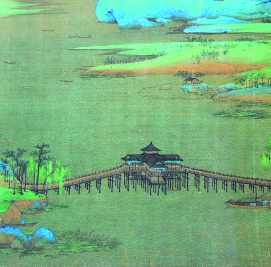 高聳的山峰和鮮亮的青綠色彩,是小提琴不斷演奏出的主旋律,豐滿厚實;緩坡、沼澤、流水恰似豎琴撥出的慢板,舒緩悠揚;高掛的瀑布和巉巖懸崖就像低音鼓敲擊出的節奏,鏗鏘深沉;建筑、舟船和人物活動如同長笛吹響的快板,輕盈跳躍。畫中的各組群山不是簡單地循環往復,而是有許多變化,如變換山體造型、增換瀑布和溪流以及建筑群等,細節變化則更多、更豐富,如同樂曲中的“變奏”。不同的節奏與情緒,在不斷地交織、變化中融合,一起奏響了北宋宮廷文化的燦爛之聲。