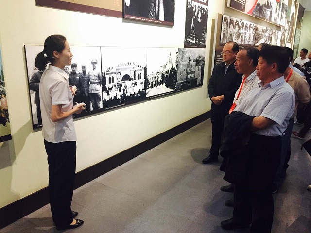 采訪團團長白庚勝、副團長豐收認真聆聽講解員介紹兵團歷史