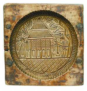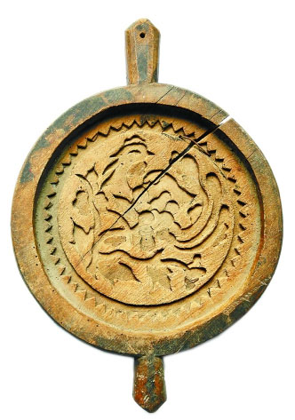 “鳳穿牡丹”是月餅模具中的一件難得的佳品,是于進江在舊貨市場一堆老家具當中偶然發現的,模具上落滿灰塵,有些裂紋。其造型獨特,具有雙把手形式。這種樣式在宋元時期比較多,明代以后就少了。此款是明嘉靖年間的作品,雕刻風格簡潔明快。畫面中的鳳凰在太陽的光芒下活靈活現。鳳穿牡丹的紋樣在明代早期的瓷器、服飾上較為流行。在這件模具上還留有墨跡題刻,記錄主家的姓氏、制作時間??梢娫趥鹘y月餅的制作上,也有為家族手工定制的?,F如今,月餅制作很少再沿襲手工的習俗,月餅模具也離開了人們的視線。