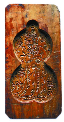 這款民國制作的較為特殊的異形月餅模具“福祿同喜”,是于進江在多年前從一位藏家手中“換得”的。而交換的籌碼是當年還被視為“稀有品”的手機。葫蘆紋樣在古代備受推崇,但是作為異形葫蘆的月餅模具卻極為難得。而在紋樣的選取上,一般是“喜”字、“壽”字和“玉兔”,單獨的嫦娥玉兔卻很少見。不同于傳統的技藝,這塊模具將仕女圖的繪制技法融合其中??梢?,在小小的一塊模具上也大有乾坤,無論是民間藝術品還是大師佳品,都是多元藝術元素融合的結晶。