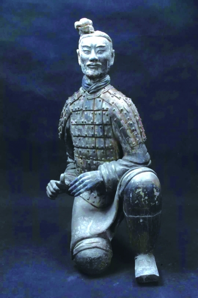 展覽入口處的序廳首先展出了一組秦始皇兵馬俑,象征了秦國橫掃六合、統一中國建立秦王朝。展覽由此拉開序幕,引導觀眾進入展覽,遨游秦漢時代。其中,展出的重裝步兵俑出土于秦兵馬俑2號坑弩兵方陣的中心?!肮蛏湮涫抠傅乃茉毂绕鹨话愕奶召敢泳?,對表情神態和發髻、甲片、履底等的刻畫生動傳神,并且文物原本的彩繪保存狀況極好,真實表現了秦軍作戰的情景?!眹┕ぷ魅藛T說,立射武士俑反映了秦代遠程部隊弓弩兵的作戰方式,與跪射武士俑相配合再現了遠射作戰的場景。