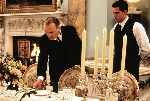 史蒂文斯口中的獲得“尊嚴”,等于是建功立業的一種修辭。為了管家的“尊嚴”,這兩次會議上,他都為了服務權貴而從親愛的人最迫切的需求面前走開,一次是彌留之際的父親,一次是哭泣著決心嫁與他人的肯頓小姐。電影做了稍許美化,前一次將彌留改為了剛剛去世,后一次增加了他在心煩意亂中摔碎酒瓶的情節。