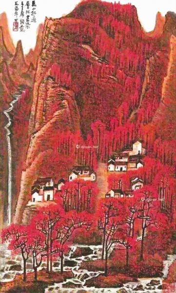 1962年至1964年,李可染用故宮內府有著刻骨般紅色的朱砂畫了多幅 《萬山紅遍》。畫面尺幅不一,但主調都是紅,朱砂和墨色交相輝映出一派金秋景色,層林盡染的群山頂天立地,錯落其間的飛瀑、白墻、云氣則像被擠出的留白,因周遭濃郁色彩的映襯,愈發顯得明亮奪目、攝人心魄。至于所畫景致,據說既非岳麓山,也非橘子洲頭,但似乎比實景描寫意境更高、更富于感染力,可以理解為藝術家澎湃激情的傾瀉。