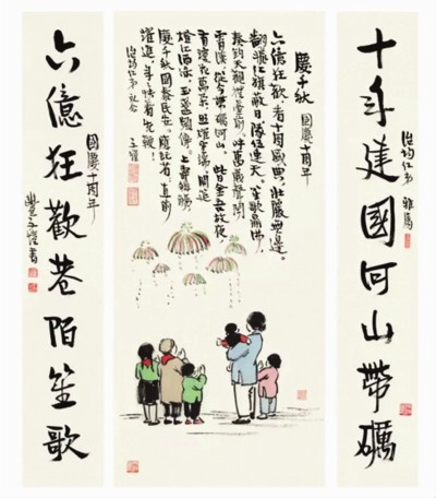 前不久滬上舉行的一次拍賣會上,豐子愷書畫作品 《慶千秋》 和 《行書八言》 聯袂亮相,喚起人們很多溫暖記憶。繪畫 《慶千秋》,寥寥數筆描繪出大人孩子觀賞煙花時其樂融融的場景。這是豐子愷在新中國成立以后的代表作,隨畫面溢出的不僅是溫暖和幸福,還有無限的希望。人們不難感受到,他的漫筆抒情畫隨新時代而得到重生。當時,豐子愷已舉家遷入上海陜西南路39弄93號的“日月樓”,安居樂業,闔家幸福,躊躇滿志。生活狀況的穩定,讓曾經飽受戰爭流離、饑餓病困的他感到“溫暖和平而幸?!?,興奮與感動之情溢于筆墨之間。