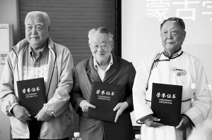 今年9月,內蒙古大學舉行“蒙古學研究60年”校友論壇,向創建蒙古語言文學專業的元老確精扎布教授(右一)及歷史學專業的元老等頒了發榮譽證書。資料圖片