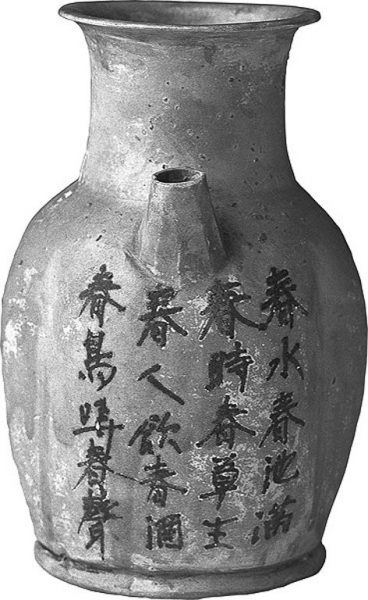 據周世榮先生的考證和其他學者的初步清理,已經發現的62首完整的瓷器題詩中,見于《全唐詩》和《全唐詩續補遺》者共九首,見于其他傳世文獻者一首,另外可確定的先唐詩一首;其余大多是當時流行的民間詩歌或窯工們的即興創作。也就是說,當年的窯工中有相當一部分人不僅識文斷字,還會寫詩。他們不需要像文人那樣拘泥于詩學理論,不需要咬文嚼字去推敲,就是在和泥拉胚或添柴燒火之際,自己心一動,想到什么順手寫下來,刻在那些器物上:“天地平如水,王道自然開。家中無學子,官從何處來?”