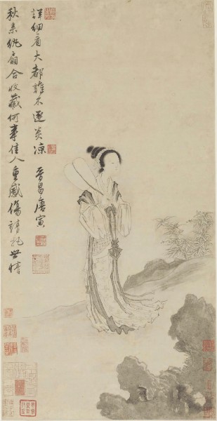 上海博物館書畫研究部主任凌利中告訴記者,新陳列中首次露面以及許久未展的展品有25件,其中最受業界關注的莫過于唐伯虎的 《秋風紈扇圖軸》?!斑@是中國古代書畫史上繞不過去的一件作品,說到唐伯虎的水墨人物畫,人們第一個想到的就是它?!绷枥姓f,在“明四家”中,唐伯虎是個性最鮮明的一個,雖有“江南第一風流才子”名號,但一生坎坷不得志?!肚镲L紈扇圖軸》 描繪了一名手持紈扇佇立在秋風中的美人,她側身凝望,眉宇間微露悵惘神色。畫軸左上角有畫家自題詩:“秋來紈扇合收藏,何事佳人重感傷,請把世情詳細看,大都誰不逐炎涼?!蓖干涑鎏埔淖試@之情。