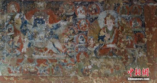 10月26日,從西藏自治區山南市文化局(市文物局)獲悉,該單位與湖南省文物考古研究所組成的調查組發現“果拉康”遺址。遺存內壁畫保存較完好,研究人員初步推測其形成于14世紀前后,距今約700年。圖為遺址中的壁畫。 中新社記者 賈英杰 攝