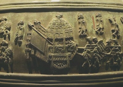 鹵簿鐘此番在博物館里是裸展,雖然設了一個矮圍欄,但絲毫無礙探身細看,因此每個細節都歷歷在目,鑄在鐘上的“千里江山圖”也是如此。不過既有《鹵簿鐘的年代研究》在先,則仍以照引為宜:“鹵簿鐘身飾紋第四層,凸鑄一條橫繞鐘身一周的山水紋帶。這條飾紋帶,是由三段相同的畫面相連結,構成一幅氣勢磅礴,山勢連綿的山水圖卷。就其畫面內容,擇其一段,則可窺其全貌。畫面取景作橫卷式,以六座高山前后交錯布列,成為整個畫面的中心。六座高山分前后兩排,形成一條由右向左的狹長山谷,由于前排三山的遮擋,在畫面上形成了三個空間:第一個空間,右下角有一行者趕著毛驢,將從溪上小橋走過,沿著前方的夾谷山路而去。在其右邊的山谷里,一勞作者似荷鋤而歸。在其前上方的山腳下,有一茅屋隱約可見。第二個空間,是由左面相連的三山和左面一山相對,中間出現一條斜長的