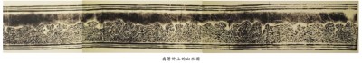 山谷,溪水沿谷底而流。左上方,有一亭式建筑倚立于左三山的山坳之前。右山腳下的溪水邊,停泊著一小木舟,景象異常恬靜。第三個空間,則是第二個空間左三山向左的延續,在畫面最左面的山坳間,亦有兩座茅屋隱現。有的茅屋頂上挑著一面小旗,是為酒肆的標志。從整個畫面看,近景是峰巒迭嶂,遠景則是山勢連綿。樹木、溪流、小橋、木舟、茅屋、酒肆等點綴其間?!薄熬望u簿鐘飾紋帶所表現的山水題材來說,也具有北宋繪畫中山水長卷的時代特征?!?/p>