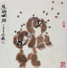 如果只集中畫猴,未免有些單調,因此也想畫畫其它動物,畫動物莫過于劉繼卣、韓美林,因此,我翻閱了他們的畫冊,特別是韓美林的動物,生動可愛,筆調簡練,不完全寫實,加上了一些裝飾符號,加之又有童趣,對我的啟發很大,但我畫的是中國畫小品,與他的作品有區別,所以,只學習他取其動物類別之廣泛。