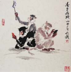 去年,和幾個學生一起去廣州旅游,看到地鐵里的一道風景線,乘坐地鐵的人,除了個別老人,其他的不管男、女、大人、小孩都緊握手機,目不轉睛,旁若無人,仿佛中了邪似的。無獨有偶,打開手機正好發現黃永玉先生的一張漫畫“花果山開會” ,一群小猴子,都在玩手機,猴王宣布,開會了,不要玩手機,我便取巧畫了一張“各自為政” ,三只猴子,兩只在看微信,一只在玩自拍。