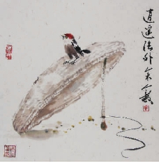 有時候,大自然會無私地恩賜給你美好的創意。記得是一個秋天的下午,我去花溪的陽光水鄉畫殘荷,偶然發現一只青蛙爬到了干枯了的蓮蓬頂上,昂首張望,一副“孤芳自賞”的姿態,我趕緊拍了一張照片,便又促成一趣。