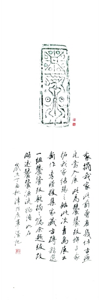 《我拓我家》最早入展的饕餮器物是一片古燕半瓦,我們特意請著名建筑學家、好友覃力教授題跋。他完全是以一個建筑專業人士的視角,來題寫這段跋語的:“先秦瓦當已有飾動物、云紋、夔文圖案者,此類瓦當與后世差異較大。其中戰國之燕瓦,有饕餮之紋樣,風格質樸,獨具一格,向為藏家所重?!睅拙湓捑桶寻氩拷ㄖ范己w其中了。這件燕瓦實為饕餮紋飾與《我拓我家》結緣之始。而兩年之后的青島新作展,因我家又陸續購藏了一些饕餮磚,使得李瑾可以搜羅更多的饕餮紋飾精拓送展?!段彝匚壹摇放c饕餮紋飾的緣分也更深更廣了。