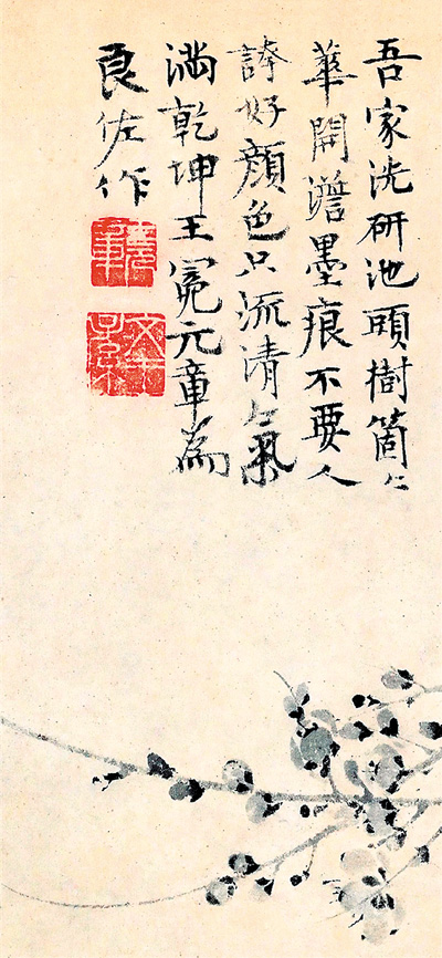 王冕出身農家,幼年替人放牛,靠自學成才。后來預感天下將亂,遂隱居會稽九里山,造三間茅廬,自題為“梅花書屋”,可見其對梅花的癡迷。在王冕的另一首題名《白梅》詩中:“冰雪林中著此身,不同桃李混芳塵。忽然一夜清香發,散作乾坤萬里春?!备憩F了王冕的錚錚傲骨。