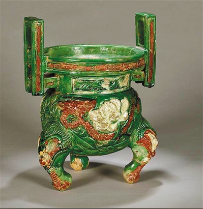 其中一款名為《琉璃三彩龍穿花直耳爐》的爐具吸引了眾多市民圍觀。此爐高28.5厘米、口徑為18厘米、底足12.5厘米,為琉璃三彩制器,以綠釉為底色,間施紅、白色釉分別裝飾龍紋與牡丹紋。頸部刻有香草紋,腹部使用浮雕技藝來表現飛龍游戲與盛開的牡丹之間,底部則由三條獅首足盛托爐身,顯得頗為有氣勢。據閻焰介紹,此爐為明代制品,大約為公元1368年~1644年間制造,至今約450年歷史?!斑@是一場用沉香點燃的文化穿越之旅?!遍愌嬲f。