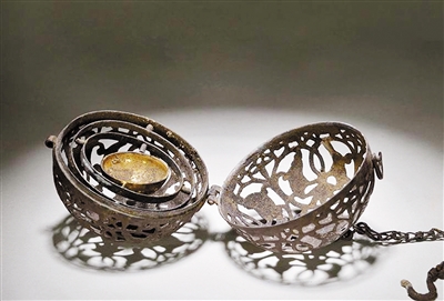 另有一款唐代《鎏金碗銀鏤空香熏》為銀質,呈圓球形,通體鏤空。無論外壁球體如何轉動,由于機環和銀盂的重力作用,香盂始終保持重心向下,里面盛放的沉香不致撒落。閻焰介紹說,這一原理類似今日航空和精密機械常用的水平陀螺儀。同類香囊法門寺、何家村均有出土,為唐時貴族用器。
