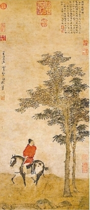 《人騎圖》中的“騎”字是由“馬”和“奇”組成的會意字,“奇”字古義為“異”和“大”,作為量詞與“偶”相反,而“偶”就是俗的意思,《后漢書·獨行列傳》中對獨行之士的描繪就為歷代文人推崇。遠古時期的馬也是以多數出現,或是被組成騎兵團參戰,或是作為天子貴族出行的馬車,孔穎達《左傳正義》說至六國時始有單騎。所以,不同凡俗之人才能騎馬獨行,“千里走單騎”的關羽就是一例。趙孟頫把自己畫成唐代騎馬的獨行之士,正是一種內心獨白:因為秉持道義,所以具有一意孤行的勇氣。