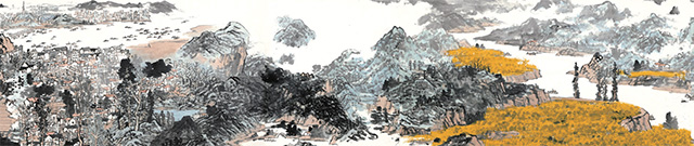 長江是母親河,長江經濟帶的提出預示著這里將是我國發展戰略的重要依托。因此,創作長江題材作品的使命,使何家安產生了強烈的創作沖動。他于2013年開始動筆,多次沿江徒步寫生收集素材,耗時5年完成了長105米、高1.25米的巨幅長卷。畫作西起金沙江源頭,東至上海吳淞口,用精湛的筆墨重點刻畫了重慶、武漢、南京、上海等城市,同時還描繪了三峽大壩、長江大橋等現代建筑,使這一繪畫題材有了鮮明的時代特征?!堕L江新卷》既有千山萬壑、山重水復、咫尺天涯之意趣,又有筆精墨妙、酣暢淋漓之痛快,充分體現出畫家豐富的生活積累和深厚的傳統功力。本次展覽共分為兩部分,除展出《長江新卷》外,還展出了藝術家近期的部分作品。