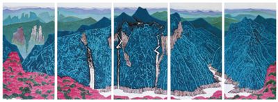 近些年,陳家泠的丹青抒懷,由花鳥意趣,更多寄寓山水之境。他將廣涉“人山花”以及書法各個領域的感悟融注一處,從故鄉的“西湖十景”,到“三山五岳四圣”,再到紅色山水系列,文化情愫和時代美景,成就了他筆下的千里江山。主題山水巨作,也成為此次展覽最引人注目的所在。