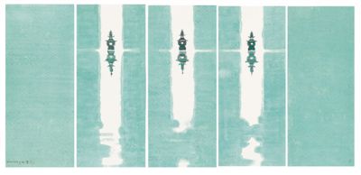 在陳家泠筆下,“三潭印月”水天一色,湖面清波蕩漾,以淡墨暈染于絹上,更顯幽深靜雅;“柳浪聞鶯”是線的世界,拂面的柳絲柔美地飛舞著,盡展春日西湖的勃勃生機;“花港觀魚”以色彩取勝,“花著魚身魚嘬花”,一派魚樂人歡的場景……十件作品風格各異、形式各異,各盡其妙,各現其境,最終以五條屏的形式,統一為一個整體。那是他對家鄉、對母校感恩又眷戀的情感表達。